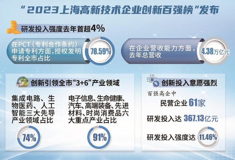 “2023上海高新技術(shù)企業(yè)創(chuàng)新百?gòu)?qiáng)榜”以2022年度統(tǒng)計(jì)數(shù)據(jù)為基礎(chǔ),從創(chuàng)新投入、創(chuàng)新人才、創(chuàng)新產(chǎn)出等角度對(duì)上海高企創(chuàng)新發(fā)展成果和綜合能力進(jìn)行評(píng)價(jià)。統(tǒng)計(jì)顯示,上海高企研發(fā)投入強(qiáng)度去年首超4%。在PCT(專利合作條約)申請(qǐng)專利方面,上海高企申請(qǐng)數(shù)量占全市62.23%,授權(quán)發(fā)明專利全市占比78.59%;在企業(yè)營(yíng)收能力方面,上海高企去年總營(yíng)收4.38萬億元,企均凈利潤(rùn)3030.50萬元。