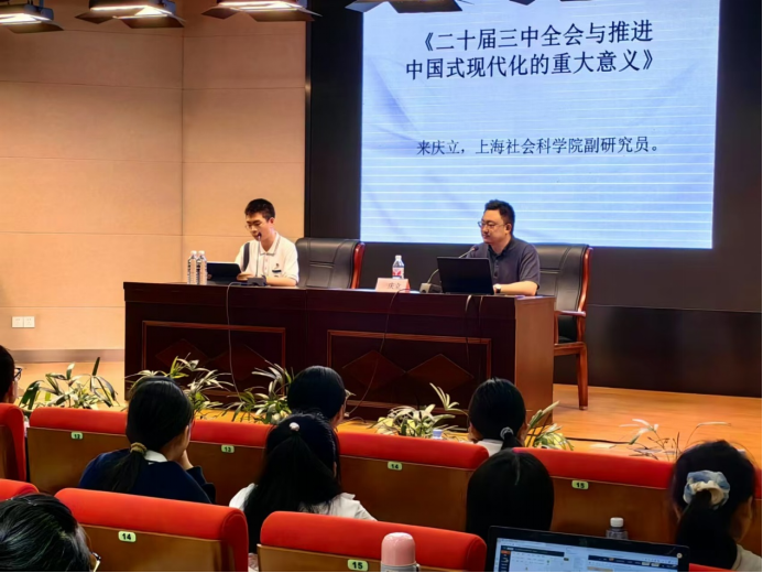 7月30日,講師團副團長來慶立副研究員受寶山區(qū)教育局邀請,為寶山教育系統(tǒng)青年團員講授《二十屆三中全會與推進中國式現(xiàn)代化的重大意義》。講座以通俗易懂的方式解讀了黨的二十屆三中全會的重大意義,分析了中國式現(xiàn)代化的歷史邏輯和現(xiàn)實邏輯,論述了上海在推進中國式現(xiàn)代化中發(fā)揮的龍頭帶動和示范引領(lǐng)作用。